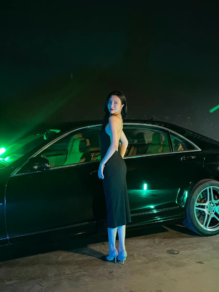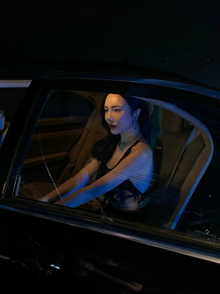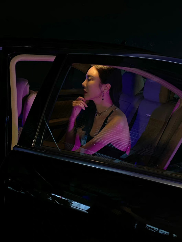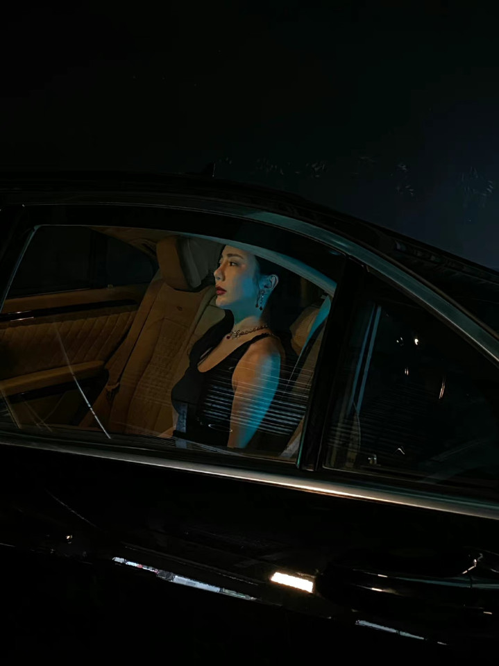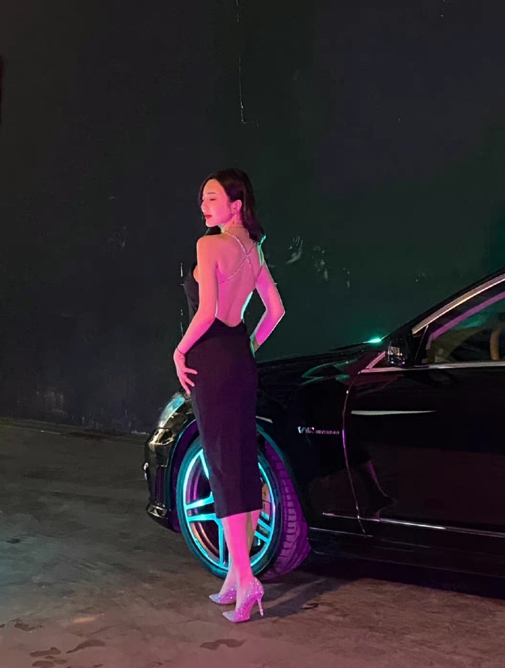 身着黑色露背长裙的女子侧身而立,精致的链条装饰沿脊线蜿蜒,勾勒出优雅的背部线条。暗调光影下,她回眸凝视,红唇与冷白肤色形成鲜明对比,车身反射的紫光为整体添上一抹神秘氛围,尽显妩媚、冷艳与高级感。